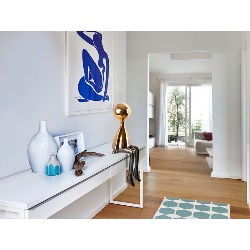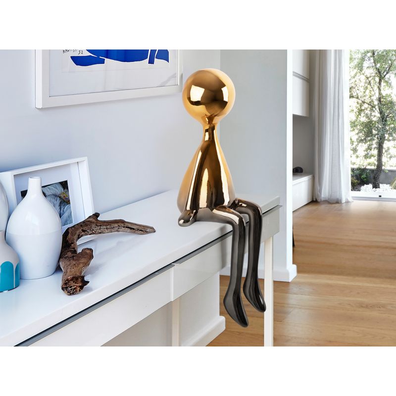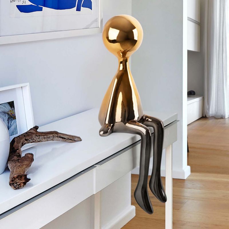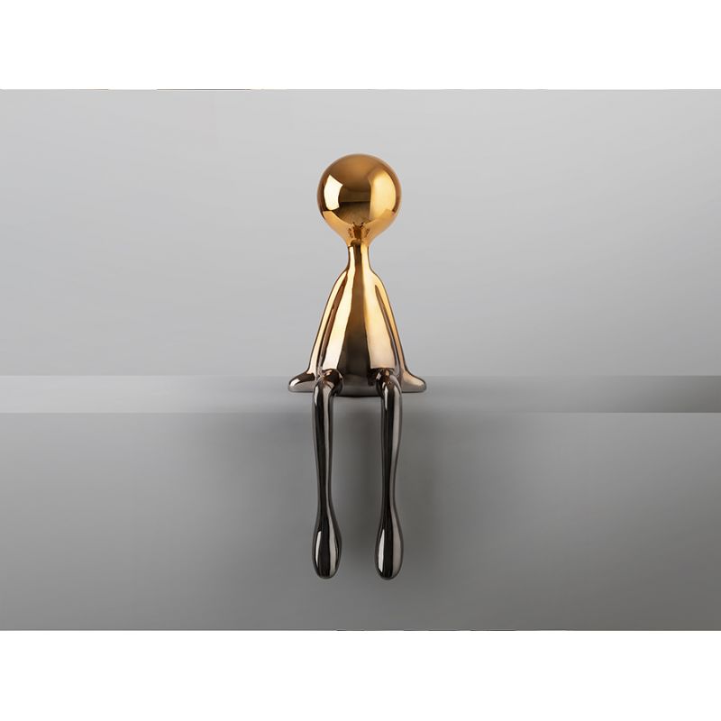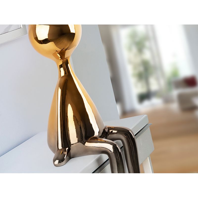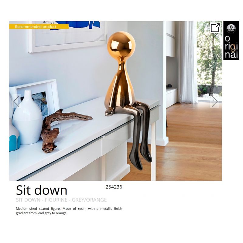 | Materiale | figură așezată de dimensiuni medii, fabricată din rășină, cu un gradient de finisaj metalic de la gri plumb la portocaliu |
