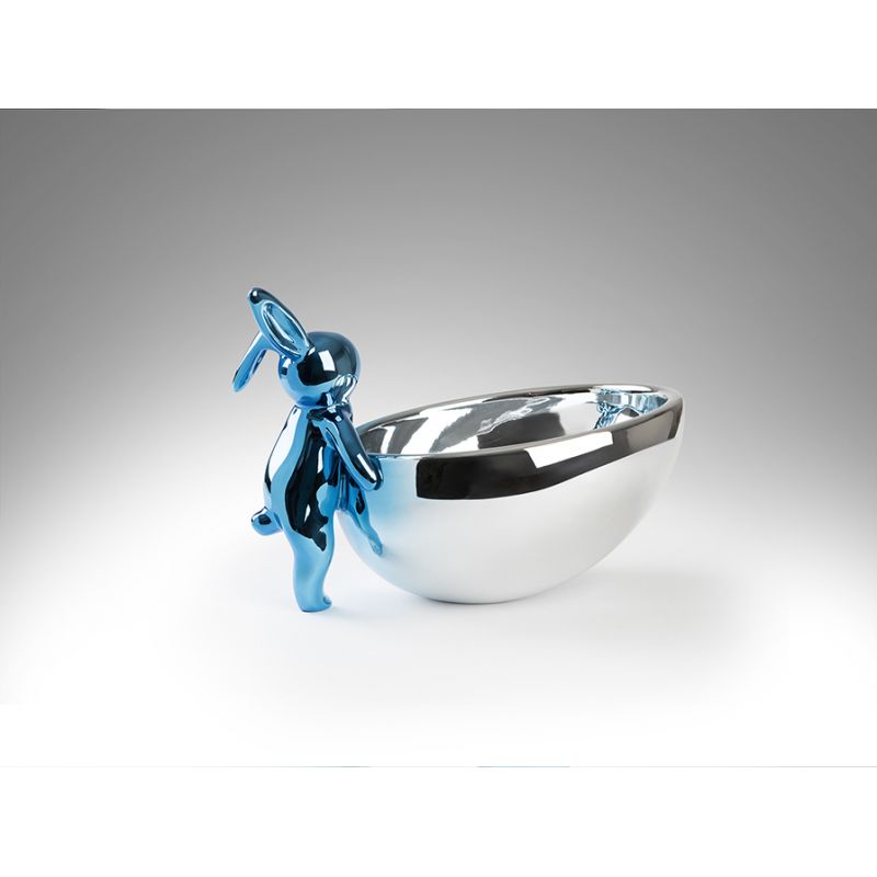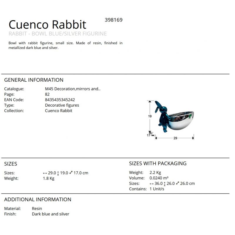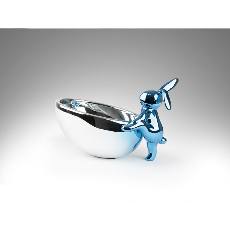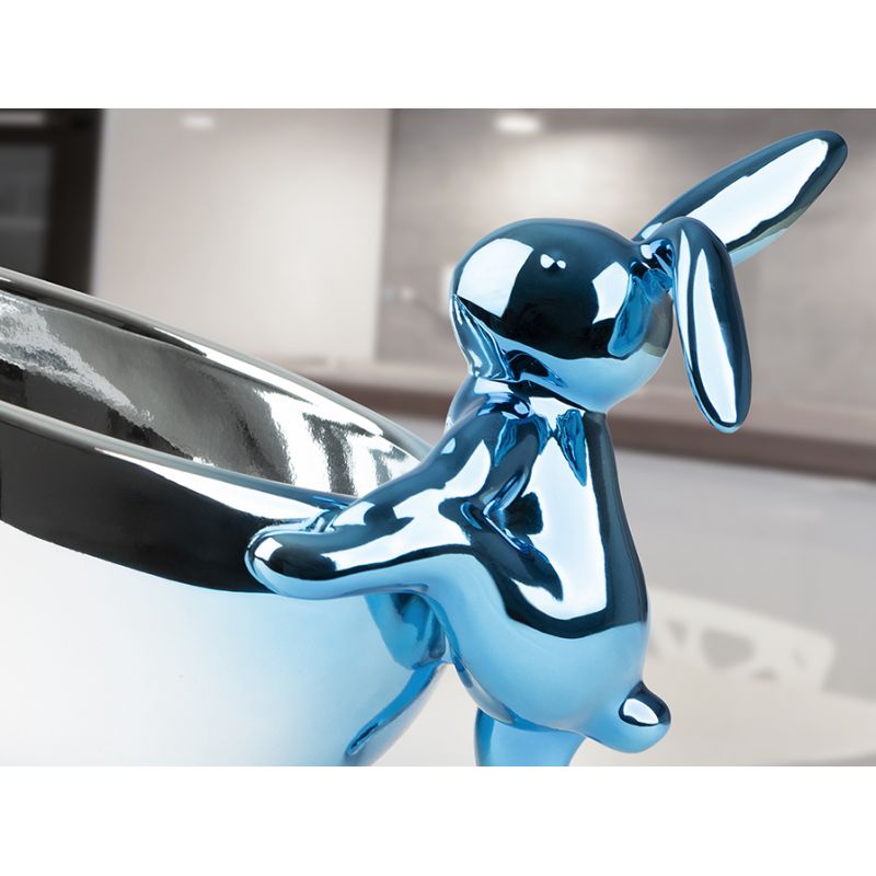 | Materiale | bol cu figurină iepure, de dimensiuni mici, fabricat din rășină, finisat în albastru închis metalizat și argintiu |