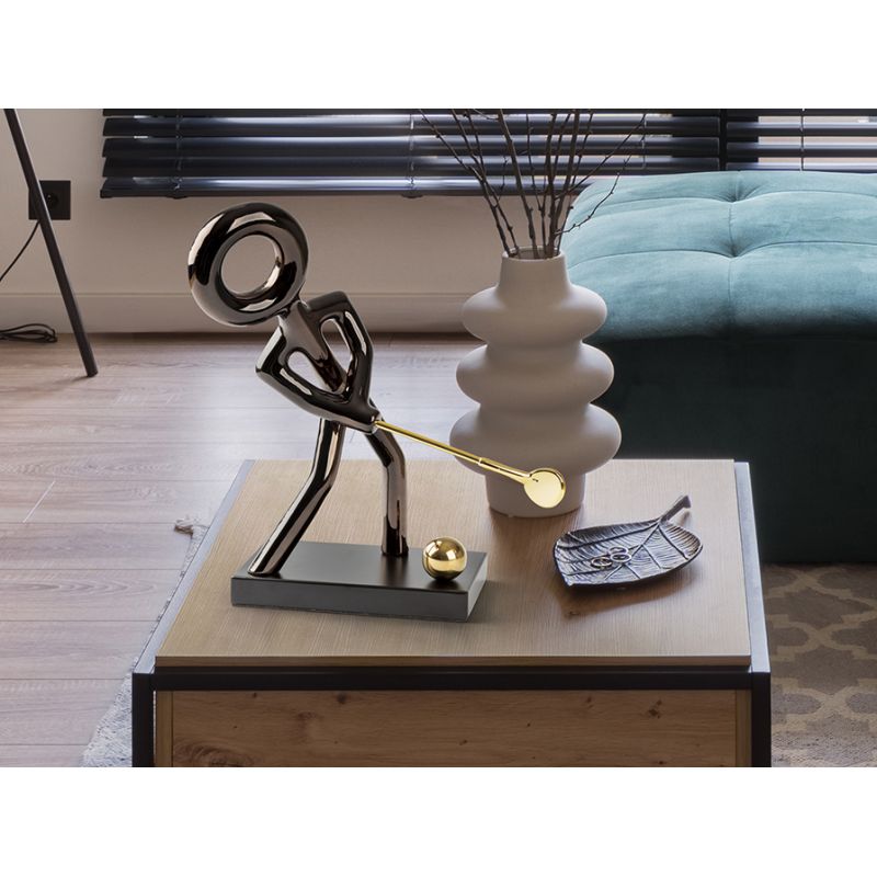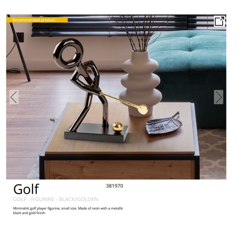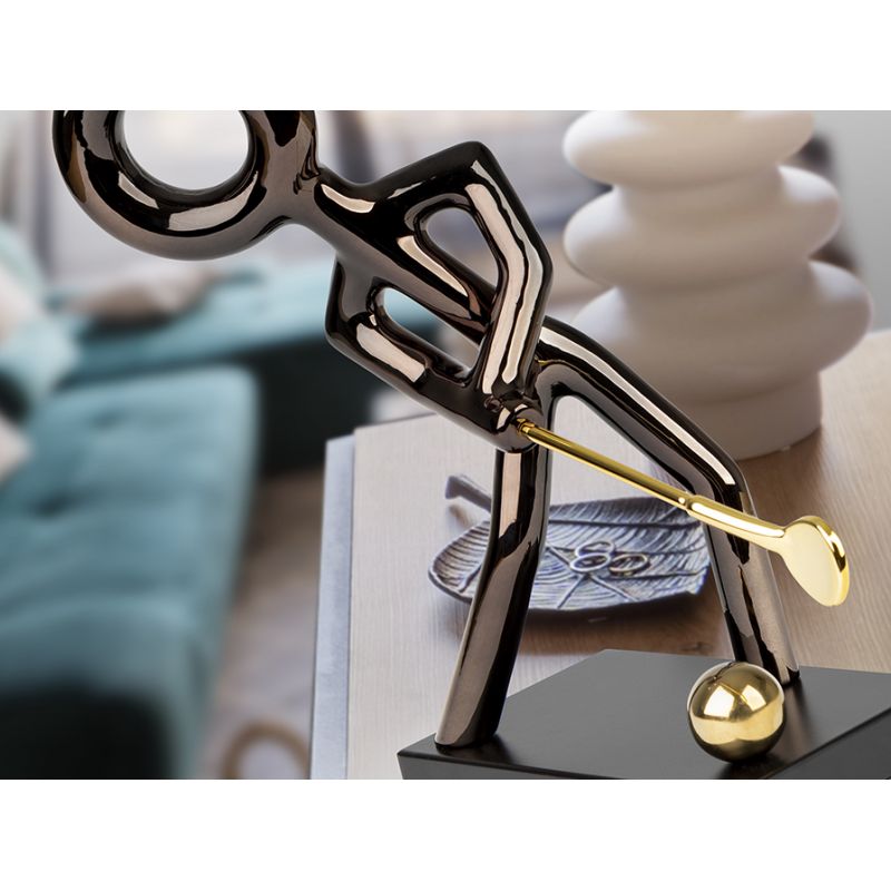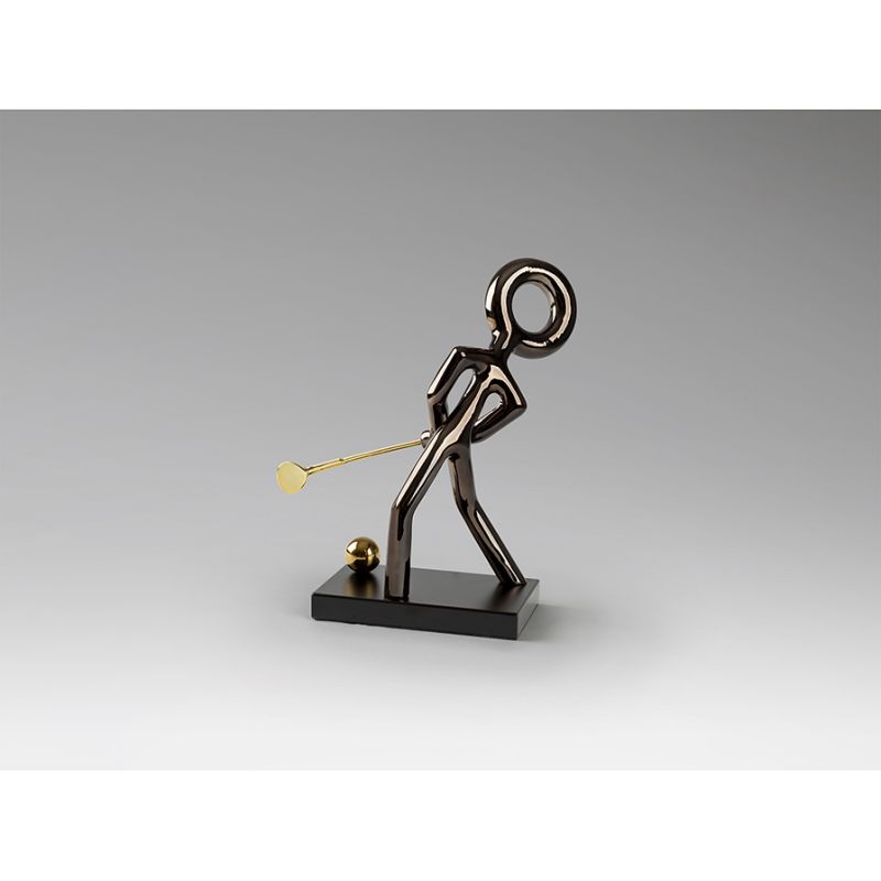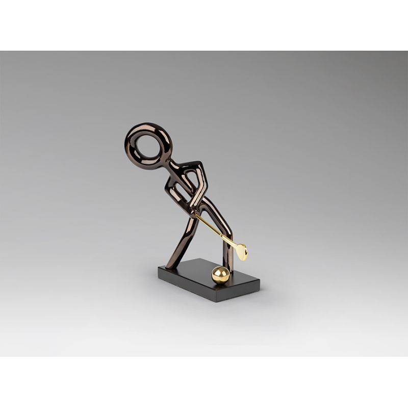 | Materiale | figurină minimalistă de jucător de golf, de dimensiuni mici, fabricată din rășină cu finisaj metalic negru și auriu. |