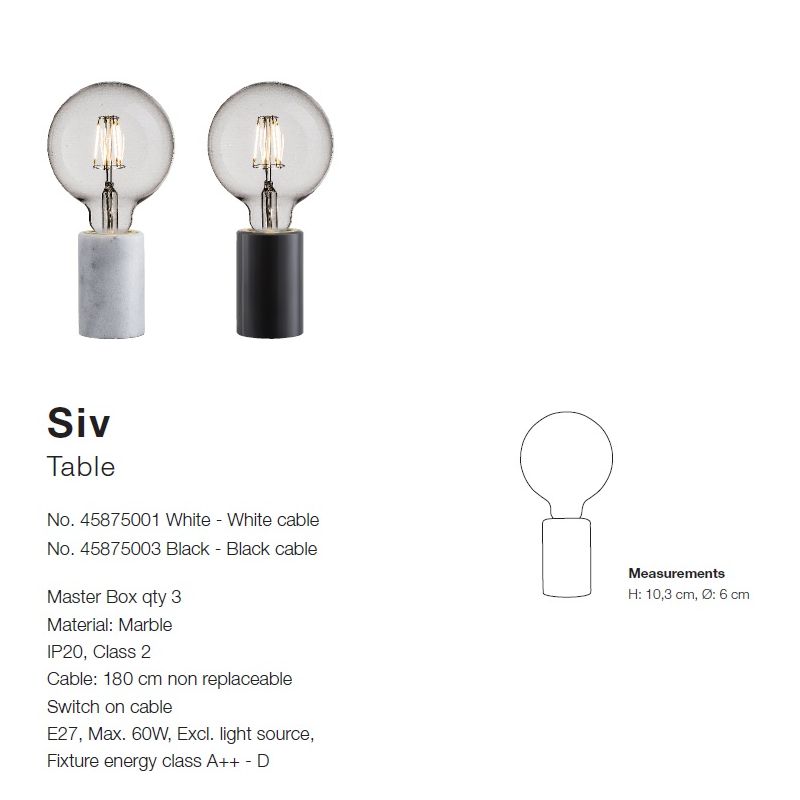 Veioza design minimalist Siv este piesa centrală decorativa, care incorporează un stil rafinat și deosebit. Realizată din marmură neagră sau albă, la care un bec decorativ (exclus din pret) completează aspectul extravagant. Lampa se potrivește într-o bucătărie modernă, în dining sau într-o cafenea, completand iscusit amenajarea interioară în stil loft.
