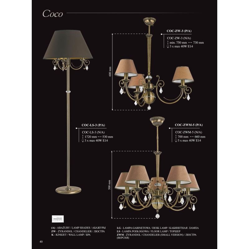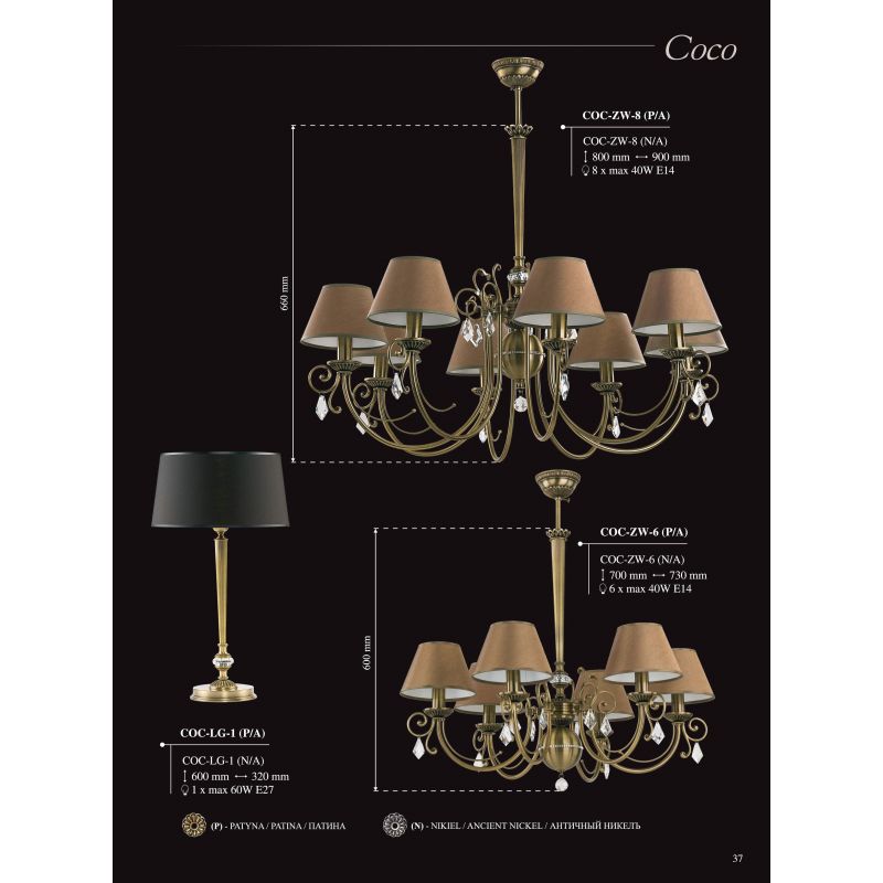 | Descriere | metal alama disponibil in 5 finisaje: alama patinata (P), alama polisata (Z), alama finisaj auriu mat (ZM), alama finisaj nickel antic (N) sau nickel lucios (BN), cristal, abajur textil disponibil in diferite culori |