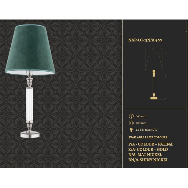 | Descriere | metal alama disponibil in 4 finisaje -alama patinata (P), alama finisaj nickel antic (N), nickel lucios (BN) sau alama polisata (Z), sticla, abajur textil disponibil in diferite culori |