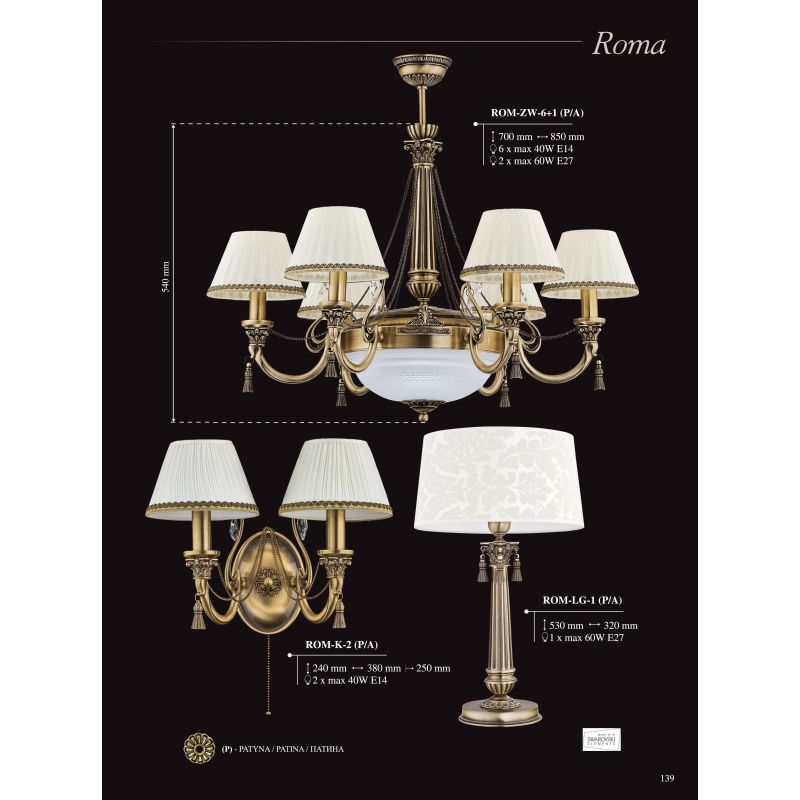 | Descriere | metal alama finisaj patinat (P), cristal, abajur textil disponibil in diferite culori |