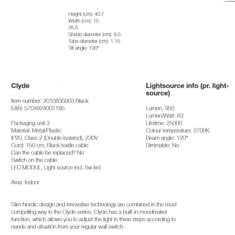 Clyde este o lampă de masă practică și funcțională, unde capul lămpii poate fi reglat în sus și în jos în funcție de necesități și situație. Funcția moodmaker care vă permite să reglați lumina în trei pași, de la întrerupător, face ca lampa să fie ideală pentru iluminarea caldă în camera de zi și dormitor, lângă pat sau canapea.