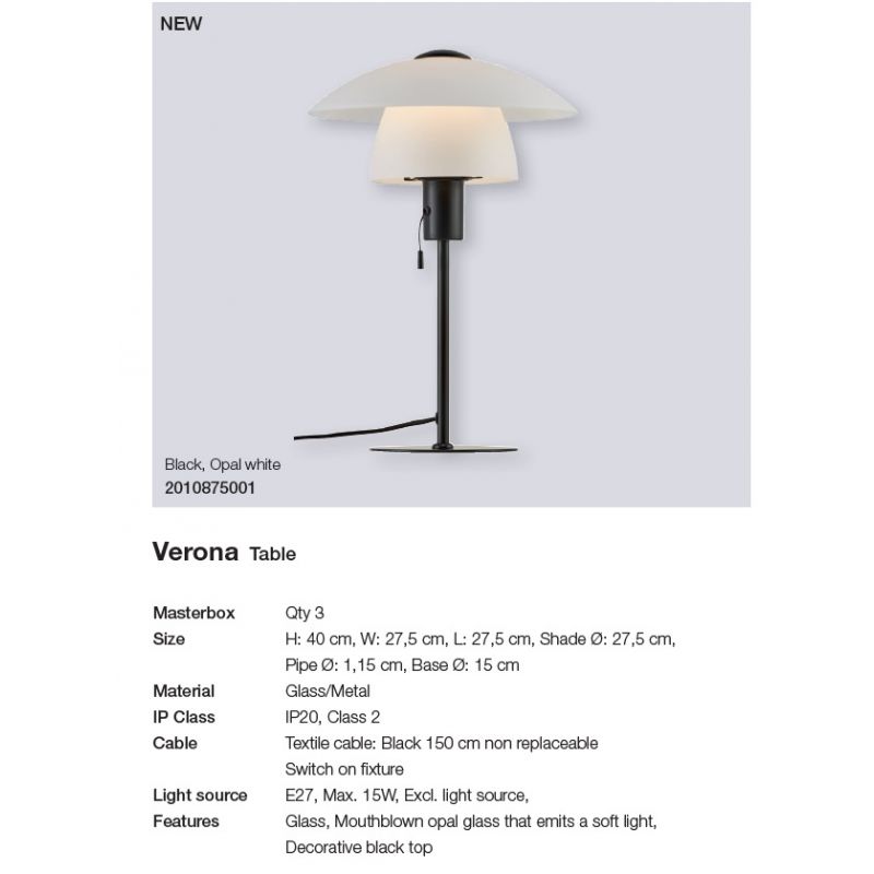 Verona este o serie tradițională de lustre într-un design clasic scandinav. Verona este construită din două frumoase nuanțe de sticlă albă opacă care asigură o distribuție uniformă a luminii în cameră. Simultan, contrastul dintre sticla albă opacă și metalul negru mat contribuie la un aspect modern.