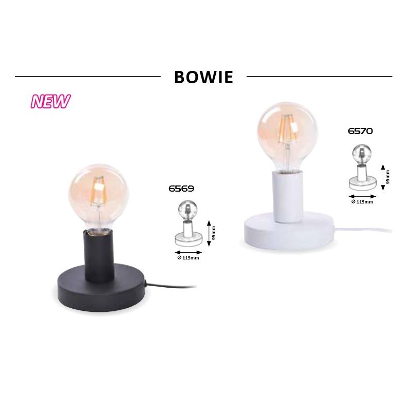 Veioza neagră Bowie are un design simplu, totuși aspectuos, putând fi un accesoriu elegant al multor încăperi. Poate fi amplasată pe noptieră, în camera de zi pe o masă joasă sau chiar în camera de lucru, pe birou. Lampa cu placă decorativă rotundă, neagră, amintește de o lumânare arzând, de mici dimensiuni.