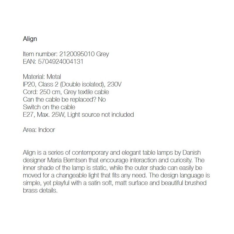 Align este o serie de lămpi de masă contemporane și elegante ale designerului danez Maria Berntsen care încurajează interacțiunea și curiozitatea. Umbra interioară a lămpii este statică, în timp ce umbra exterioară poate fi ușor mutată pentru o lumină schimbătoare care se potrivește oricărei nevoi. Limbajul de design este simplu, dar jucaus, cu o suprafață moale satinată, mată și detalii frumoase din alamă periată.