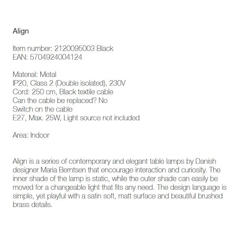 Align este o serie de lămpi de masă contemporane și elegante ale designerului danez Maria Berntsen care încurajează interacțiunea și curiozitatea. Umbra interioară a lămpii este statică, în timp ce umbra exterioară poate fi ușor mutată pentru o lumină schimbătoare care se potrivește oricărei nevoi. Limbajul de design este simplu, dar jucaus, cu o suprafață moale satinată, mată și detalii frumoase din alamă periată.