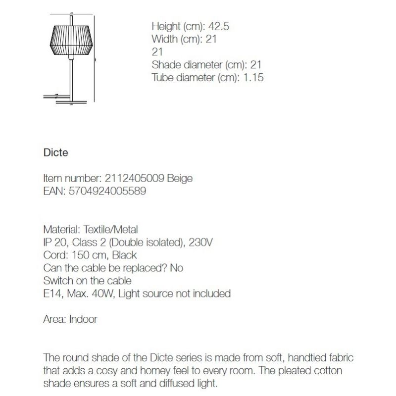 Nuanța rotundă a seriei Dicte este realizată dintr-o țesătură moale, îmbrăcată manual, care adaugă o senzație confortabilă și casnică fiecărei camere. Abajurul mare din bumbac plisat asigură o lumină moale și difuză, care este suspendată elegant de baza curbată a lămpii - pentru a se apleca deasupra unui fotoliu sau a unei măsuțe de cafea.