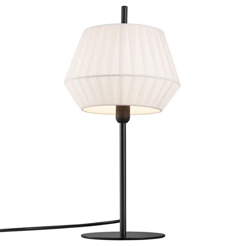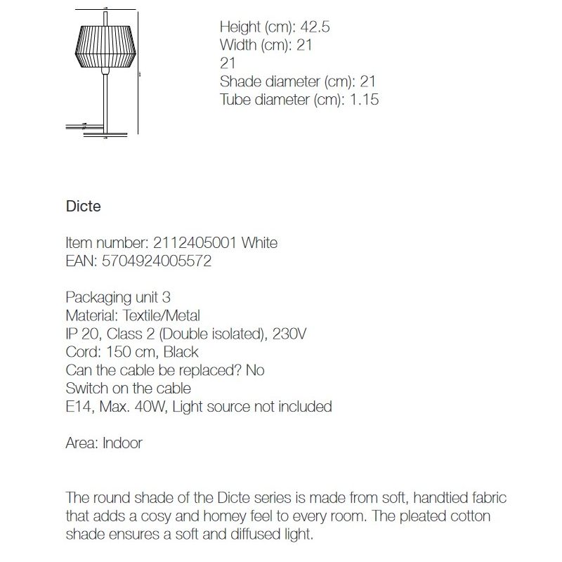 Nuanța rotundă a seriei Dicte este realizată dintr-o țesătură moale, îmbrăcată manual, care adaugă o senzație confortabilă și casnică fiecărei camere. Abajurul mare din bumbac plisat asigură o lumină moale și difuză, care este suspendată elegant de baza curbată a lămpii - pentru a se apleca deasupra unui fotoliu sau a unei măsuțe de cafea.