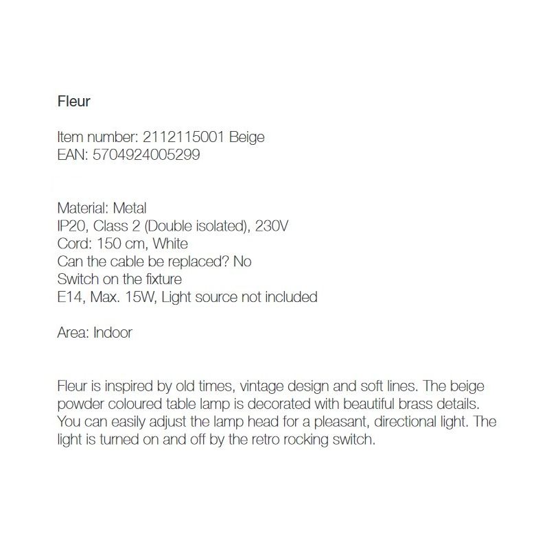 Fleur este inspirat de vremuri vechi, design vintage și linii moi. Lampa de masă de culoare bej pudră este decorată cu detalii frumoase din alamă. Puteți regla cu ușurință capul lămpii pentru o lumină plăcută și direcțională. Lumina este aprinsă și oprită de comutatorul retro.