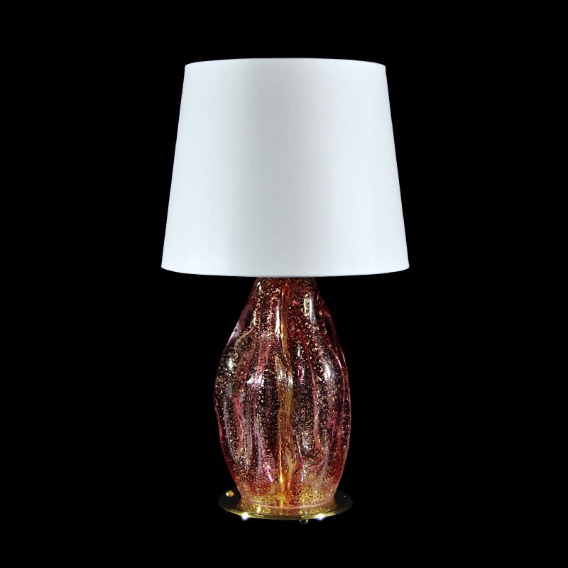 | Materiale | sticlă transparenta cu detalii rosii, abajur textil alb, metal finisaj alama lucioasa, cablu 1,5m cu stecher |